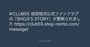 OTOKOTIMES @OtokoTimes1988 – 17:22・2024年11月1日 2024 11/01 2024-11-01 #CLUB55 成田昭次公式ファンフラグの「SHOJI’S STORY」が更新されました🤍 https://club55.shoji-narita.com/message/ Source:https://x.com/OtokoTimes1988/status/18522649252... text X Post この記事が気に入ったら フォローしてね! Follow @OtokoTimes1988 よかったらシェアしてね! URLをコピーしました! ニッポン放送「KURE オキーフ Presents 成田昭次のRockon The Knight」 @RockonTheKnight - 17:06・2024年11月1日 東京レコード @tokyo_records - 10:05・2024年11月2日