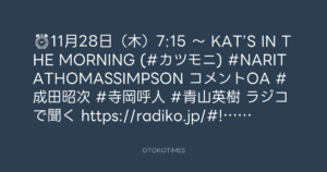OTOKOTIMES @OtokoTimes1988 – 22:17・2024年11月27日 2024 11/27 2024-11-27 ⏰ 11月28日(木)7:15 〜 KAT’S IN THE MORNING (#カツモニ) #NARITATHOMASSIMPSON コメントOA #成田昭次 #寺岡呼人 #青山英樹 📻ラジコで聞く https://radiko.jp/#!/ts/NORTHWAVE/20241128071500 Source:https://x.com/OtokoTimes1988/status/18617613233... text X Post この記事が気に入ったら フォローしてね! Follow @OtokoTimes1988 よかったらシェアしてね! URLをコピーしました! 東京レコード @tokyo_records - 18:01・2024年11月27日 2024.11.28 - KAI☆CHOO @ STAFF BLOG(AddicTripS)