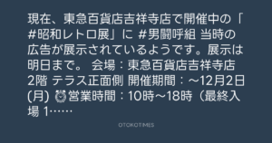 現在、東急百貨店吉祥寺店で開催中の「#昭和レトロ展」に #男闘呼組 当時の広告が展示されているようです。展示は明日まで。