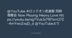 OTOKOTIMES @OtokoTimes1988 – 20:30・2024年12月6日 2024 12/06 2024-12-06 @YouTube #ロックオン武道館 同時視聴会 Now Playing Heavy Love https://youtu.be/sgTVukJz7I8?si=lJ7Z-4mYwo2xqD_d @YouTubeより Source:https://x.com/OtokoTimes1988/status/18649957561... text X Post この記事が気に入ったら フォローしてね! Follow @OtokoTimes1988 よかったらシェアしてね! URLをコピーしました! OTOKOTIMES @OtokoTimes1988 - 20:28・2024年12月6日 OTOKOTIMES @OtokoTimes1988 - 20:31・2024年12月6日