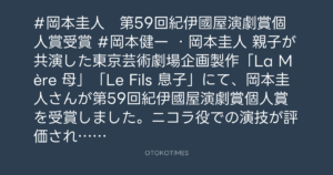 #岡本健一 ・岡本圭人 親子が共演した東京芸術劇場企画製作「La Mère 母」「Le Fils 息子」にて、岡本圭人さんが第59回紀伊國屋演劇賞個人賞を受賞しました。ニコラ役での演技が評価されました。