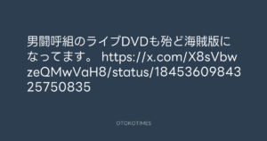 OTOKOTIMES @OtokoTimes1988 – 17:50・2025年1月5日 2025 1/05 2025-01-05 男闘呼組のライブDVDも殆ど海賊版になってます。 https://x.com/X8sVbwzeQMwVaH8/status/1845360984325750835 Source:https://x.com/OtokoTimes1988/status/18758273043... text X Post この記事が気に入ったら フォローしてね! Follow @OtokoTimes1988 よかったらシェアしてね! URLをコピーしました! OTOKOTIMES @OtokoTimes1988 - 17:49・2025年1月5日 🎬 SHACHIHOKO PARADISE @ZIP_SHACHI_DISE - 20:00・2025年1月5日