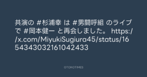 OTOKOTIMES @OtokoTimes1988 – 21:41・2025年1月7日 2025 1/07 2025-01-07 共演の #杉浦幸 は #男闘呼組 のライブで #岡本健一 と再会しました。 https://x.com/MiyukiSugiura45/status/1654343032161042433 Source:https://x.com/OtokoTimes1988/status/18766100611... text X Post この記事が気に入ったら フォローしてね! Follow @OtokoTimes1988 よかったらシェアしてね! URLをコピーしました! OTOKOTIMES @OtokoTimes1988 - 21:35・2025年1月7日 Koyo Maeda @koyomaeda - 7:47・2025年1月8日