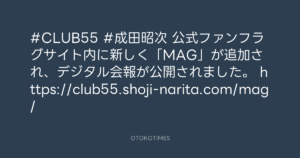 OTOKOTIMES @OtokoTimes1988 – 23:34・2025年1月10日 2025 1/10 2025-01-10 #CLUB55 #成田昭次 公式ファンフラグサイト内に新しく「MAG」が追加され、デジタル会報が公開されました。 https://club55.shoji-narita.com/mag/ Source:https://x.com/OtokoTimes1988/status/18777256426... text X Post この記事が気に入ったら フォローしてね! Follow @OtokoTimes1988 よかったらシェアしてね! URLをコピーしました! ニッポン放送「KURE オキーフ Presents 成田昭次のRockon The Knight」 @RockonTheKnight - 17:06・2025年1月10日 OTOKOTIMES @OtokoTimes1988 - 1:26・2025年1月11日