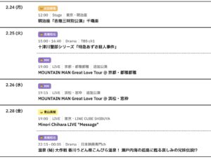 OTOKOTIMES @OtokoTimes1988 – 21:24・2025年1月28日 2025 1/28 2025-01-28 📅 2/24〜3/2までのスケジュールをお届けします。 ※現時点で確認可能な範囲のみ。 (2025/1/28 更新) Source:https://x.com/OtokoTimes1988/status/18842160142... image X Post この記事が気に入ったら フォローしてね! Follow @OtokoTimes1988 よかったらシェアしてね! URLをコピーしました! OTOKOTIMES @OtokoTimes1988 - 21:23・2025年1月28日 OTOKOTIMES @OtokoTimes1988 - 21:25・2025年1月28日