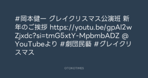 OTOKOTIMES @OtokoTimes1988 – 22:09・2025年1月28日 2025 1/28 2025-01-28 #岡本健一 グレイクリスマス公演班 新年のご挨拶 https://youtu.be/gpAl2wZjxdc?si=tmG5xtY-MpbmbADZ @YouTubeより #劇団民藝 #グレイクリスマス Source:https://x.com/OtokoTimes1988/status/18842273630... text X Post この記事が気に入ったら フォローしてね! Follow @OtokoTimes1988 よかったらシェアしてね! URLをコピーしました! OTOKOTIMES @OtokoTimes1988 - 22:09・2025年1月28日 OTOKOTIMES @OtokoTimes1988 - 22:19・2025年1月28日