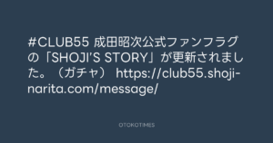 OTOKOTIMES @OtokoTimes1988 – 19:32・2025年1月31日 2025 1/31 2025-01-31 #CLUB55 成田昭次公式ファンフラグの「SHOJI’S STORY」が更新されました。(ガチャ) https://club55.shoji-narita.com/message/ Source:https://x.com/OtokoTimes1988/status/18852749924... text X Post この記事が気に入ったら フォローしてね! Follow @OtokoTimes1988 よかったらシェアしてね! URLをコピーしました! ニッポン放送「KURE オキーフ Presents 成田昭次のRockon The Knight」 @RockonTheKnight - 17:56・2025年1月31日 OTOKOTIMES @OtokoTimes1988 - 19:48・2025年1月31日