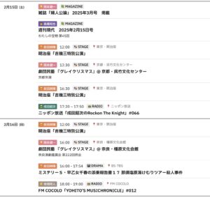 OTOKOTIMES @OtokoTimes1988 – 13:07・2025年2月15日 2025 2/15 2025-02-15 📅 2/15〜2/16までのスケジュールをお届けします。 ※現時点で確認可能な範囲のみ。 (2025/2/15 更新) Source:https://x.com/OtokoTimes1988/status/18906138472... image X Post この記事が気に入ったら フォローしてね! Follow @OtokoTimes1988 よかったらシェアしてね! URLをコピーしました! 2025.02.15 - KAI☆CHOO @ PHOTO(AddicTripS) OTOKOTIMES @OtokoTimes1988 - 13:08・2025年2月15日