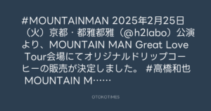 2025年2月25日(火)京都・都雅都雅(@h2labo)公演より、MOUNTAIN MAN Great Love Tour会場にてオリジナルドリップコーヒーの販売が決定しました。