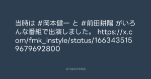 OTOKOTIMES @OtokoTimes1988 – 23:03・2025年3月18日 2025 3/18 2025-03-18 当時は #岡本健一 と #前田耕陽 がいろんな番組で出演しました。 https://x.com/fmk_instyle/status/1663435159679692800 Source:https://x.com/OtokoTimes1988/status/19019978336... text X Post この記事が気に入ったら フォローしてね! Follow @OtokoTimes1988 よかったらシェアしてね! URLをコピーしました! OTOKOTIMES @OtokoTimes1988 - 22:12・2025年3月18日 Koyo Maeda @koyomaeda - 9:27・2025年3月19日