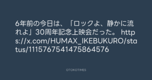 🎬 OTOKOTIMES @OtokoTimes1988 – 13:14・2025年5月10日 2025 5/10 2025-05-10 6年前の今日は、「ロックよ、静かに流れよ」30周年記念上映会だった。 https://x.com/HUMAX_IKEBUKURO/status/1115767541475864576 Source:https://x.com/OtokoTimes1988/status/19210562780... text VIDEO X Post この記事が気に入ったら フォローしてね! Follow @OtokoTimes1988 よかったらシェアしてね! URLをコピーしました! OTOKOTIMES @OtokoTimes1988 - 12:20・2025年5月10日 OTOKOTIMES @OtokoTimes1988 - 13:57・2025年5月10日