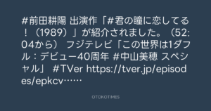 OTOKOTIMES @OtokoTimes1988 – 22:27・2025年6月12日 2025 6/12 2025-06-12 #前田耕陽 出演作「#君の瞳に恋してる!(1989)」が紹介されました。(52:04から) 📺フジテレビ「この世界は1ダフル:デビュー40周年 #中山美穂 スペシャル」 #TVer https://tver.jp/episodes/epkcvym9k78?p=3125 Source:https://x.com/OtokoTimes1988/status/19331541129... text X Post この記事が気に入ったら フォローしてね! Follow @OtokoTimes1988 よかったらシェアしてね! URLをコピーしました! 質問BOX – 2025年6月12日(CLUB 55) 寺岡 呼人 @yohitoteraoka - 11:57・2025年6月13日(IG post)