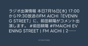 本日7月16日(水) 17:00から19:30放送のFM AICHI「EVENING STREET」に、前田耕陽がコメント出演します。