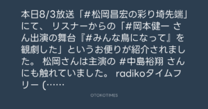 リスナーからの「#岡本健一 さん出演の舞台『#みんな鳥になって』を観劇した」というお便りが紹介されました。