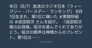 本日(8/7)放送のラジオ日本「ウィークリー・バースデー・ランキング」