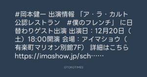 OTOKOTIMES @OtokoTimes1988 – 8:21・2025年10月4日 2025 10/04 2025-10-04 #岡本健一 出演情報 「ア・ラ・カルト公認レストラン #僕のフレンチ」 に日替わりゲスト出演 🗓 出演日:12月20日(土)18:00開演 📍 会場:アイマショウ(有楽町マリオン別館7F) 詳細はこちら https://imashow.jp/schedule/1830/ Source:https://x.com/OtokoTimes1988/status/19742536056... text X Post この記事が気に入ったら フォローしてね! Follow @OtokoTimes1988 よかったらシェアしてね! URLをコピーしました! Kazuya Takahashi @hankykazy - 22:30・2025年10月3日(IG post) OTOKOTIMES @OtokoTimes1988 - 9:21・2025年10月4日