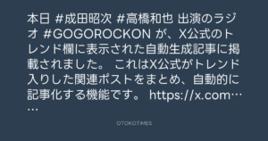 OTOKOTIMES @OtokoTimes1988 – 23:28・2025年10月12日 2025 10/12 2025-10-12 本日 #成田昭次 #高橋和也 出演のラジオ #GOGOROCKON が、X公式のトレンド欄に表示された自動生成記事に掲載されました。 これはX公式がトレンド入りした関連ポストをまとめ、自動的に記事化する機能です。 https://x.com/i/trending/1977373339631960202 Source:https://x.com/OtokoTimes1988/status/19773807805... text X Post この記事が気に入ったら フォローしてね! Follow @OtokoTimes1988 よかったらシェアしてね! URLをコピーしました! KURE 5-56 Presents Go! Go! Rockon! @GoGoRockon_556 - 23:05・2025年10月12日 OTOKOTIMES @OtokoTimes1988 - 23:42・2025年10月12日