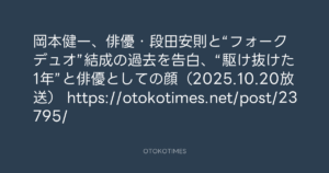 OTOKOTIMES @OtokoTimes1988 – 10:45・2025年10月26日 2025 10/26 2025-10-26 岡本健一、俳優・段田安則と“フォークデュオ”結成の過去を告白、“駆け抜けた1年”と俳優としての顔(2025.10.20放送) https://otokotimes.net/post/23795/ Source:https://x.com/OtokoTimes1988/status/19822623214... text X Post この記事が気に入ったら フォローしてね! Follow @OtokoTimes1988 よかったらシェアしてね! URLをコピーしました! OTOKOTIMES @OtokoTimes1988 - 22:24・2025年10月25日 Rockon Social Club @rockonsocialclub - 11:31・2025年10月26日(Instagram Stories)