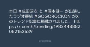 OTOKOTIMES @OtokoTimes1988 – 23:21・2025年10月26日 2025 10/26 2025-10-26 本日 #成田昭次 と #岡本健一 が出演したラジオ番組 #GOGOROCKON がXのトレンド記事に掲載されました。 https://x.com/i/trending/1982448882052153539 Source:https://x.com/OtokoTimes1988/status/19824525054... text X Post この記事が気に入ったら フォローしてね! Follow @OtokoTimes1988 よかったらシェアしてね! URLをコピーしました! KURE 5-56 Presents Go! Go! Rockon! @GoGoRockon_556 - 23:10・2025年10月26日 OTOKOTIMES @OtokoTimes1988 - 14:34・2025年10月27日
