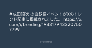 OTOKOTIMES @OtokoTimes1988 – 19:56・2025年10月29日 2025 10/29 2025-10-29 #成田昭次 の自叙伝イベントがXのトレンド記事に掲載されました。 https://x.com/i/trending/1983179432207507799 Source:https://x.com/OtokoTimes1988/status/19834879797... text X Post この記事が気に入ったら フォローしてね! Follow @OtokoTimes1988 よかったらシェアしてね! URLをコピーしました! Koyo Maeda @koyomaeda - 11:01・2025年10月29日 OTOKOTIMES @OtokoTimes1988 - 21:12・2025年10月29日