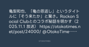 亀梨和也、「⻲の恩返し」というタイトルに「そう来たか」と驚き。Rockon Social Clubとのコラボ秘話を明かす(2025.11.1 放送)