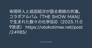 OTOKOTIMES @OtokoTimes1988 – 16:52・2025年11月18日 2025 11/18 2025-11-18 寺岡呼人と成田昭次が語る奇跡の共演。コラボアルバム『THE SHOW MAN』で生まれた数々の化学反応(2025.11.09放送) https://otokotimes.net/post/24985/ Source:https://x.com/OtokoTimes1988/status/19906895210... text X Post この記事が気に入ったら フォローしてね! Follow @OtokoTimes1988 よかったらシェアしてね! URLをコピーしました! Rockon Social Club @rockonsocialclu - 11:02・2025年11月18日 双葉社THE CHANGE @futabashachange - 5:34・2025年11月19日