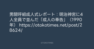 OTOKOTIMES @OtokoTimes1988 – 21:34・2026年1月12日 2026 1/12 2026-01-12 男闘呼組成人式レポート:明治神宮に4人全員で並んだ「成人の奉告」(1990年) https://otokotimes.net/post/28624/ Source:https://x.com/OtokoTimes1988/status/20106918826... text X Post この記事が気に入ったら フォローしてね! Follow @OtokoTimes1988 よかったらシェアしてね! URLをコピーしました! OTOKOTIMES @OtokoTimes1988 - 18:58・2026年1月12日 Koyo Maeda @koyomaeda - 12:15・2026年1月13日