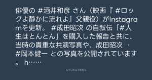 俳優の #酒井和彦 さん(映画『 #ロックよ静かに流れよ』父親役)がInstagramを更新。 #成田昭次 の自叙伝「#人生はとんとん」を購入した報告と共に、当時の貴重な共演写真や、成田昭次#岡本健一 との写真を公開されています。