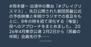 #岡本健一 出演中の舞台「#グレイクリスマス」、先日公開された劇団民藝公式の予告映像と年明けラジオでの言及をもとに、8年の時を経て深化する「権堂」役へのアプローチをまとめました。
