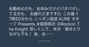 ニッポン放送「KURE オキーフ Presents 成田昭次のRockon The Knight」 @RockonTheKnight – 17:05・2024年7月20日