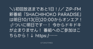 ZIP-FM新番組「SHACHIHOKO PARADISE」は明日10/13(日)20:00からオンエア!📻⚡️