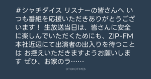 生放送当日は、皆さんに安全に楽しんでいただくためにも、ZIP-FM本社近辺にて出演者の出入りを待つことは