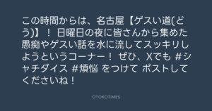 SHACHIHOKO PARADISE @ZIP_SHACHI_DISE – 20:44・2025年2月9日 2025 2/09 成田昭次 2025-02-09 この時間からは、名古屋【ゲスい道(どう)】!🚰 日曜日の夜に皆さんから集めた愚痴やゲスい話を水に流してスッキリしようというコーナー! ぜひ、Xでも #シャチダイス #煩悩 をつけて ポストしてくださいね!🌀 Source:https://x.com/ZIP_SHACHI_DISE/status/1888554548... text X Post 成田昭次 成田昭次 この記事が気に入ったら フォローしてね! Follow @OtokoTimes1988 よかったらシェアしてね! URLをコピーしました! SHACHIHOKO PARADISE @ZIP_SHACHI_DISE - 20:37・2025年2月9日 SHACHIHOKO PARADISE @ZIP_SHACHI_DISE - 20:48・2025年2月9日 関連記事 ラジオ ZIP-FM「SHACHIHOKO PARADISE」 2024.10.13 Artist 成田昭次 1968.08.01