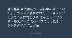 SHACHIHOKO PARADISE @ZIP_SHACHI_DISE – 20:05・2025年5月11日 2025 5/11 成田昭次 2025-05-11 近況報告📣 #成田昭次:自転車に乗っていたら、カラスに襲撃された…! #アンジェリカ:#竹内まりや さんと #サザンオールスターズ のライブに行った! #シャチダイス #zipfm Source:https://x.com/ZIP_SHACHI_DISE/status/1921521927... text X Post 成田昭次 成田昭次 この記事が気に入ったら フォローしてね! Follow @OtokoTimes1988 よかったらシェアしてね! URLをコピーしました! SHACHIHOKO PARADISE @ZIP_SHACHI_DISE - 20:00・2025年5月11日 SHACHIHOKO PARADISE @ZIP_SHACHI_DISE - 20:06・2025年5月11日 関連記事 ラジオ ZIP-FM「SHACHIHOKO PARADISE」 2024.10.13 Artist 成田昭次 1968.08.01