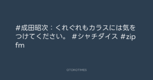 SHACHIHOKO PARADISE @ZIP_SHACHI_DISE – 20:06・2025年5月11日 2025 5/11 成田昭次 2025-05-11 #成田昭次:くれぐれもカラスには気をつけてください。 #シャチダイス #zipfm Source:https://x.com/ZIP_SHACHI_DISE/status/1921522188... text X Post 成田昭次 成田昭次 この記事が気に入ったら フォローしてね! Follow @OtokoTimes1988 よかったらシェアしてね! URLをコピーしました! SHACHIHOKO PARADISE @ZIP_SHACHI_DISE - 20:05・2025年5月11日 SHACHIHOKO PARADISE @ZIP_SHACHI_DISE - 20:15・2025年5月11日 関連記事 ラジオ ZIP-FM「SHACHIHOKO PARADISE」 2024.10.13 Artist 成田昭次 1968.08.01