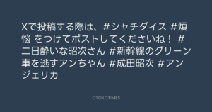SHACHIHOKO PARADISE @ZIP_SHACHI_DISE – 20:17・2025年5月18日 2025 5/18 成田昭次 2025-05-18 Xで投稿する際は、#シャチダイス #煩悩 をつけてポストしてくださいね!🌀📮 #二日酔いな昭次さん🍷 #新幹線のグリーン車を逃すアンちゃん🚄 #成田昭次 #アンジェリカ Source:https://x.com/ZIP_SHACHI_DISE/status/1924061757... text X Post 成田昭次 成田昭次 この記事が気に入ったら フォローしてね! Follow @OtokoTimes1988 よかったらシェアしてね! URLをコピーしました! SHACHIHOKO PARADISE @ZIP_SHACHI_DISE - 20:17・2025年5月18日 ニッポン放送「KURE オキーフ Presents 成田昭次のRockon The Knight」 @RockonTheKnight - 7:45・2025年5月19日 関連記事 ラジオ ZIP-FM「SHACHIHOKO PARADISE」 2024.10.13 Artist 成田昭次 1968.08.01