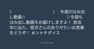 🎬 SHACHIHOKO PARADISE @ZIP_SHACHI_DISE – 20:00・2025年5月25日 2025 5/25 成田昭次 2025-05-25 ◤ ◥ 今週のはみ出し動画🎥 ◣ ◢ 今週もはみ出し動画をお届けしますよ! 放送中に出た、昭次さんのありがたいお言葉をどうぞ!💕 #シャチダイス Source:https://x.com/ZIP_SHACHI_DISE/status/1926594231... text VIDEO X Post 成田昭次 成田昭次 この記事が気に入ったら フォローしてね! Follow @OtokoTimes1988 よかったらシェアしてね! URLをコピーしました! 寺岡呼人 @yohito_teraoka - 14:01・2025年5月25日 SHACHIHOKO PARADISE @ZIP_SHACHI_DISE - 20:00・2025年5月25日 関連記事 ラジオ ZIP-FM「SHACHIHOKO PARADISE」 2024.10.13 Artist 成田昭次 1968.08.01