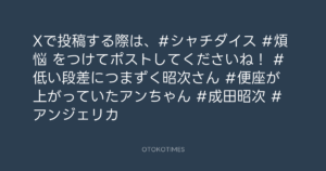 SHACHIHOKO PARADISE @ZIP_SHACHI_DISE – 21:37・2025年8月9日 2025 8/09 成田昭次 2025-08-09 Xで投稿する際は、#シャチダイス #煩悩 をつけてポストしてくださいね!🌀📮 #低い段差につまずく昭次さん🫨 #便座が上がっていたアンちゃん🚽 #成田昭次 #アンジェリカ Source:https://x.com/ZIP_SHACHI_DISE/status/1954160084... text X Post 成田昭次 成田昭次 この記事が気に入ったら フォローしてね! Follow @OtokoTimes1988 よかったらシェアしてね! URLをコピーしました! SHACHIHOKO PARADISE @ZIP_SHACHI_DISE - 21:37・2025年8月9日 2025.08.10 - MOTOM @ PHOTO(AddicTripS) 関連記事 ラジオ ZIP-FM「SHACHIHOKO PARADISE」 2024.10.13 Artist 成田昭次 1968.08.01