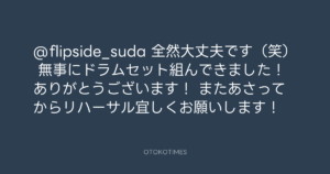 青山英樹 @aoyama_hideki – 2:07・2011年2月8日 2011 2/08 青山英樹 2011-02-08 @flipside_suda 全然大丈夫です(笑) 無事にドラムセット組んできました!ありがとうございます! またあさってからリハーサル宜しくお願いします! Source:https://x.com/aoyama_hideki/status/346594826927... text X Post 青山英樹 青山英樹 この記事が気に入ったら フォローしてね! Follow @OtokoTimes1988 よかったらシェアしてね! URLをコピーしました! 青山英樹 @aoyama_hideki - 1:45・2011年2月8日 青山英樹 @aoyama_hideki - 2:09・2011年2月8日 関連記事 Artist 青山英樹 1986.08.29