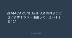 青山英樹 @aoyama_hideki – 7:39・2011年2月11日 2011 2/11 青山英樹 2011-02-11 @MACARONI_GUITAR おはようございます!ツアー頑張って下さい! ( ´ ▽ ` )ノ Source:https://x.com/aoyama_hideki/status/358302997702... text X Post 青山英樹 青山英樹 この記事が気に入ったら フォローしてね! Follow @OtokoTimes1988 よかったらシェアしてね! URLをコピーしました! 青山英樹 @aoyama_hideki - 7:12・2011年2月11日 青山英樹 @aoyama_hideki - 7:53・2011年2月11日 関連記事 Artist 青山英樹 1986.08.29