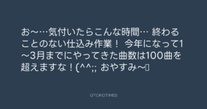 青山英樹 @aoyama_hideki – 2:44・2011年3月5日 2011 3/05 青山英樹 2011-03-05 お~…気付いたらこんな時間… 終わることのない仕込み作業! 今年になって1〜3月までにやってきた曲数は100曲を超えますな!(^^;; おやすみ~♫ Source:https://x.com/aoyama_hideki/status/437284635925... text X Post 青山英樹 青山英樹 この記事が気に入ったら フォローしてね! Follow @OtokoTimes1988 よかったらシェアしてね! URLをコピーしました! 寺岡呼人 @yohito_teraoka - 23:06・2011年3月4日 青山英樹 @aoyama_hideki - 10:56・2011年3月5日 関連記事 Artist 青山英樹 1986.08.29