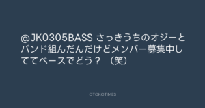 青山英樹 @aoyama_hideki – 22:14・2011年5月9日 2011 5/09 青山英樹 2011-05-09 @JK0305BASS さっきうちのオジーとバンド組んだんだけどメンバー募集中しててベースでどう? (笑) Source:https://x.com/aoyama_hideki/status/675783124064... text X Post 青山英樹 青山英樹 この記事が気に入ったら フォローしてね! Follow @OtokoTimes1988 よかったらシェアしてね! URLをコピーしました! 青山英樹 @aoyama_hideki - 21:49・2011年5月9日 青山英樹 @aoyama_hideki - 22:16・2011年5月9日 関連記事 Artist 青山英樹 1986.08.29