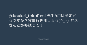 青山英樹 @aoyama_hideki – 23:05・2011年5月13日 2011 5/13 青山英樹 2011-05-13 @koukei_takafumi 先生6月は予定どうですか?食事行きましょう(^_-) ヤスさんとかも誘って! Source:https://x.com/aoyama_hideki/status/690405773118... text X Post 青山英樹 青山英樹 この記事が気に入ったら フォローしてね! Follow @OtokoTimes1988 よかったらシェアしてね! URLをコピーしました! 寺岡呼人 @yohito_teraoka - 22:29・2011年5月13日 Koyo Maeda @koyomaeda - 23:09・2011年5月13日 関連記事 Artist 青山英樹 1986.08.29