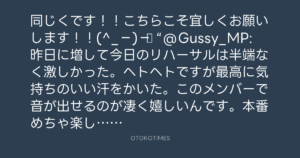 “@Gussy_MP: 昨日に増して今日のリハーサルは半端なく激しかった。ヘトヘトですが最高に気持ちのいい汗をかいた。このメンバーで音が出せるのが凄く嬉しいんです。本番めちゃ楽しみです。”