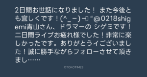 シゲミです!二日間ライブお疲れ様でした!非常に楽しかったです。ありがとうイございました!誠に勝手ながらフォローさせて頂きました。今後ともどうぞ宜しくお願い致します!