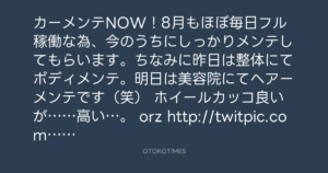 青山英樹 @aoyama_hideki – 15:15・2011年7月28日 2011 7/28 青山英樹 2011-07-28 カーメンテNOW!8月もほぼ毎日フル稼働な為、今のうちにしっかりメンテしてもらいます。ちなみに昨日は整体にてボディメンテ。明日は美容院にてヘアーメンテです(笑) ホイールカッコ良いが……高い…。 orz http://twitpic.com/5x0mt3 Source:https://x.com/aoyama_hideki/status/964638039145... text X Post 青山英樹 青山英樹 この記事が気に入ったら フォローしてね! Follow @OtokoTimes1988 よかったらシェアしてね! URLをコピーしました! Koyo Maeda @koyomaeda - 13:55・2011年7月28日 青山英樹 @aoyama_hideki - 15:54・2011年7月28日 関連記事 Artist 青山英樹 1986.08.29