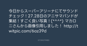 青山英樹 @aoyama_hideki – 18:57・2011年8月25日 2011 8/25 青山英樹 2011-08-25 今日からスーパーアリーナにてサウンドチェック!27.28日のアニサマバンドが集結!すごく良い写真!(*^^*) マカロニさんから画像引用しました! http://twitpic.com/6az39d Source:https://x.com/aoyama_hideki/status/106666531156... text X Post 青山英樹 青山英樹 この記事が気に入ったら フォローしてね! Follow @OtokoTimes1988 よかったらシェアしてね! URLをコピーしました! Koyo Maeda @koyomaeda - 17:31・2011年8月25日 青山英樹 @aoyama_hideki - 23:08・2011年8月25日 関連記事 Artist 青山英樹 1986.08.29
