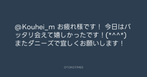 青山英樹 @aoyama_hideki – 20:45・2011年9月1日 2011 9/01 青山英樹 2011-09-01 @Kouhei_m お疲れ様です! 今日はバッタリ会えて嬉しかったです!(*^^*) またダニーズで宜しくお願いします! Source:https://x.com/aoyama_hideki/status/109230339192... text X Post 青山英樹 青山英樹 この記事が気に入ったら フォローしてね! Follow @OtokoTimes1988 よかったらシェアしてね! URLをコピーしました! 寺岡呼人 @yohito_teraoka - 18:38・2011年9月1日 青山英樹 @aoyama_hideki - 21:07・2011年9月1日 関連記事 Artist 青山英樹 1986.08.29