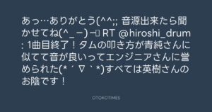 RT @hiroshi_drum: 1曲目終了!タムの叩き方が青純さんに似てて音が良いってエンジニアさんに誉められた(*´∇`*)すべては英樹さんのお陰です!