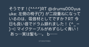 そうです!(*^^*)RT @drums000yusuke: 左側の椅子(?) が二段重ねになっているのは、吸音材としてですか?RT 今日も良い音でドラム録れました! (^_−)−☆ マイクケーブルがめずらしく青い! あっ…実は髪も…。 bit.ly/pghf88